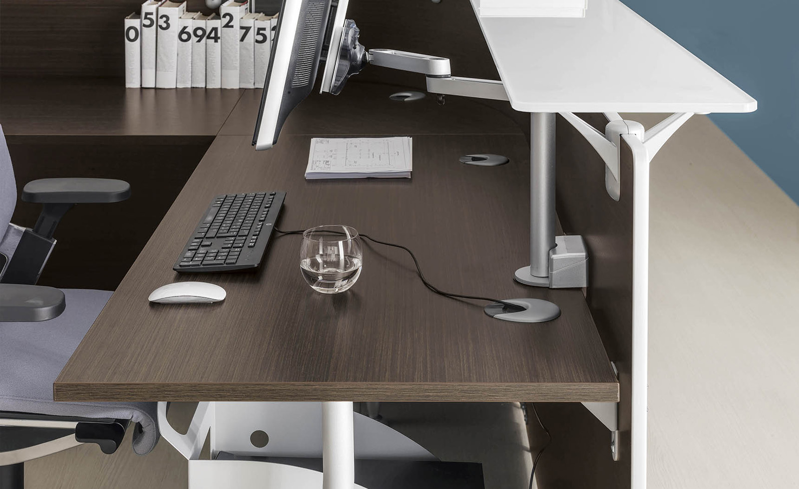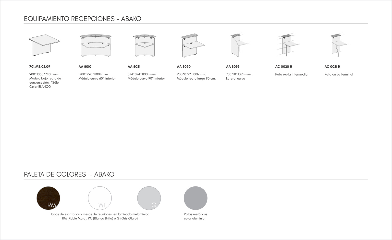 Elementos lineales, formas redondeadas, detalles de elevado valor estético e inéditas combinaciones de materiales. La serie Abako admite creativas configuraciones transformándose en una elegante y funcional tarjeta de visita de la empresa y eficiente puesto de trabajo para quienes se desempeñan como primer contacto con el público y el exterior.