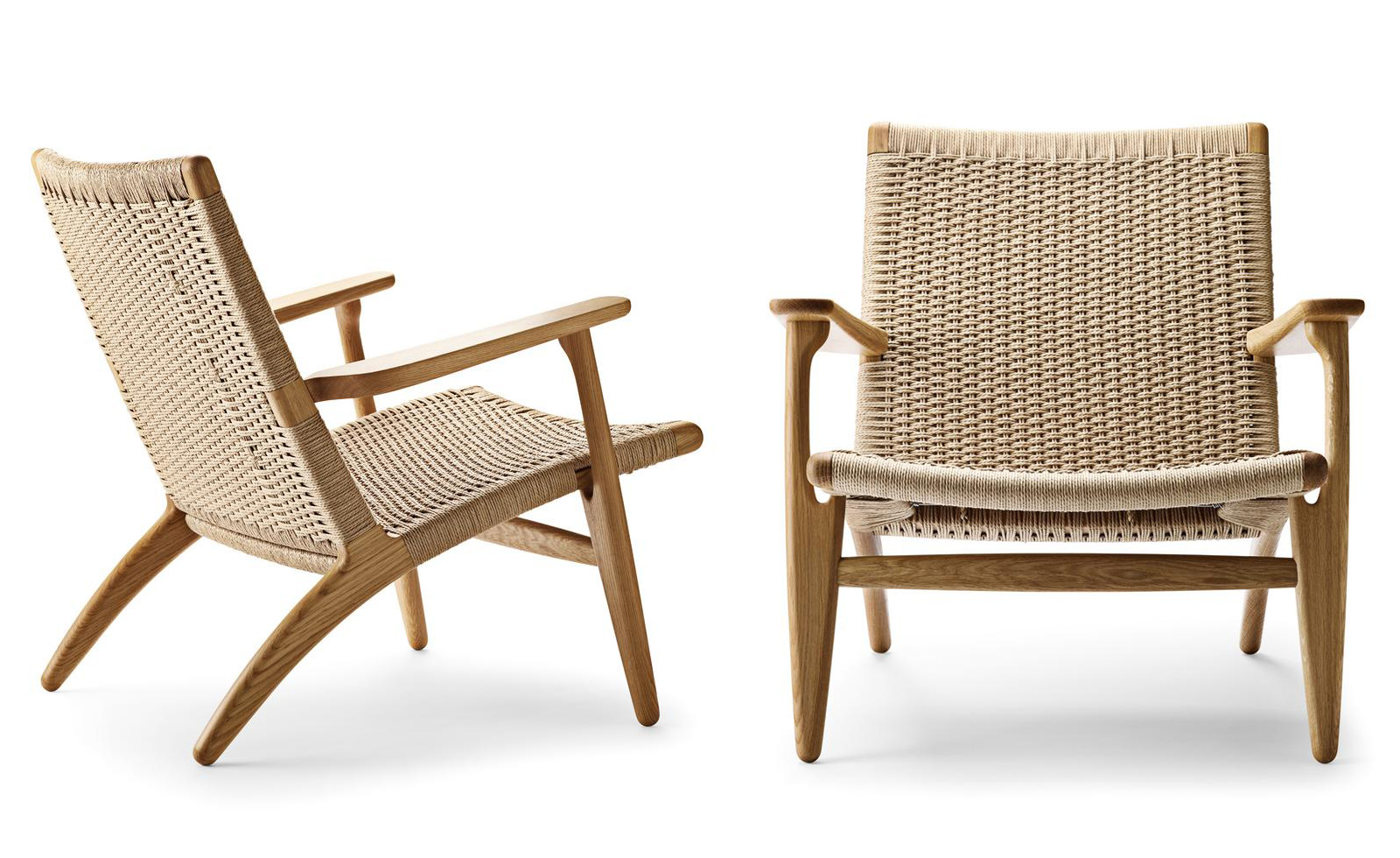 Réplica de la butaca CH25 de Hans Wegner de 1949. Estructura y brazos en madera de arce macizo, asiento y respaldo tapizados en paper cord. No recomendado para quedar a la intemperie.